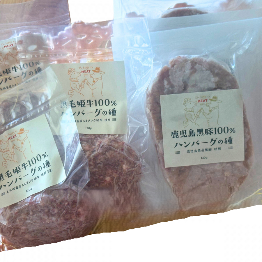 お歳暮や贈り物にピッタリな、特別なハンバーグセットが登場しました!姫牛のハンバーグの種とかごしま黒豚のハンバーグの種がセットになっており、食べ比べが楽しめる贅沢なセットです。120g ×3個の黒毛姫牛100%のハンバーグの種と120g ×3個のかごしま黒豚100%のハンバーグの種が、ひとつの箱に詰められています。