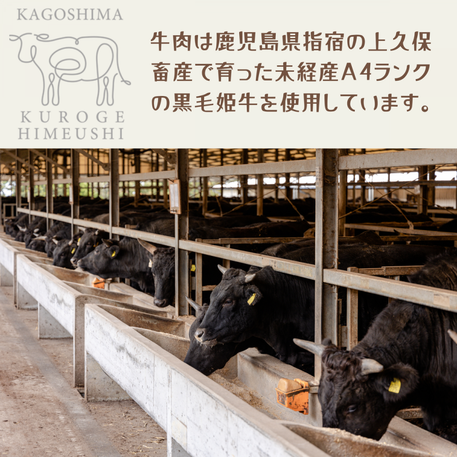原材料名:牛肉(鹿児島県産黒毛和種)、玉葱、卵、パン粉、食塩、香辛料、にんにく、(一部に小麦・卵を含む)